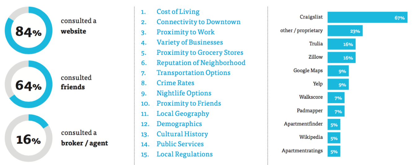 A large majority consulted both friends and websites for their decision. 84% consulted a website, 64% consulted friends, and 16% consulted a broker or agent. Many respondents consulted Craigslist.com, followed by other, proprietary sites. Some even consulted Wikipedia.org for local information.