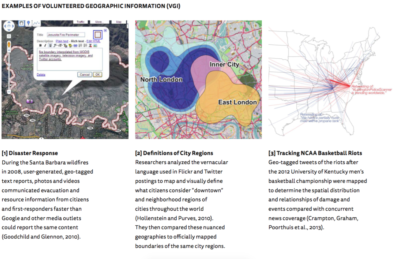 At the other end of the spectrum, user-generated information about a particular place is used to inform decisions. Michael Goodchild, a research professor at the University of California, Santa Barbara, named this particular data “Volunteered Geographic Information,” or simply “VGI” (2007). VGI is the result of large-scale engagement from social media users in the creation of online, geo-tagged content, often taking the form of images (uploaded to Flickr or Facebook, for example), or digital narratives as tweets or other social network postings. This practice creates digital translations of physical spaces as well as the human activity that occurs in those spaces. Such user-generated data proves helpful when visualized in map form, as seen on the opposite page in such cases as disaster response [1] , determining what citizens name regions of a city [2], and tracking the riots that occurred after the 2012 NCAA Men’s Basketball championship in Kentucky [3].