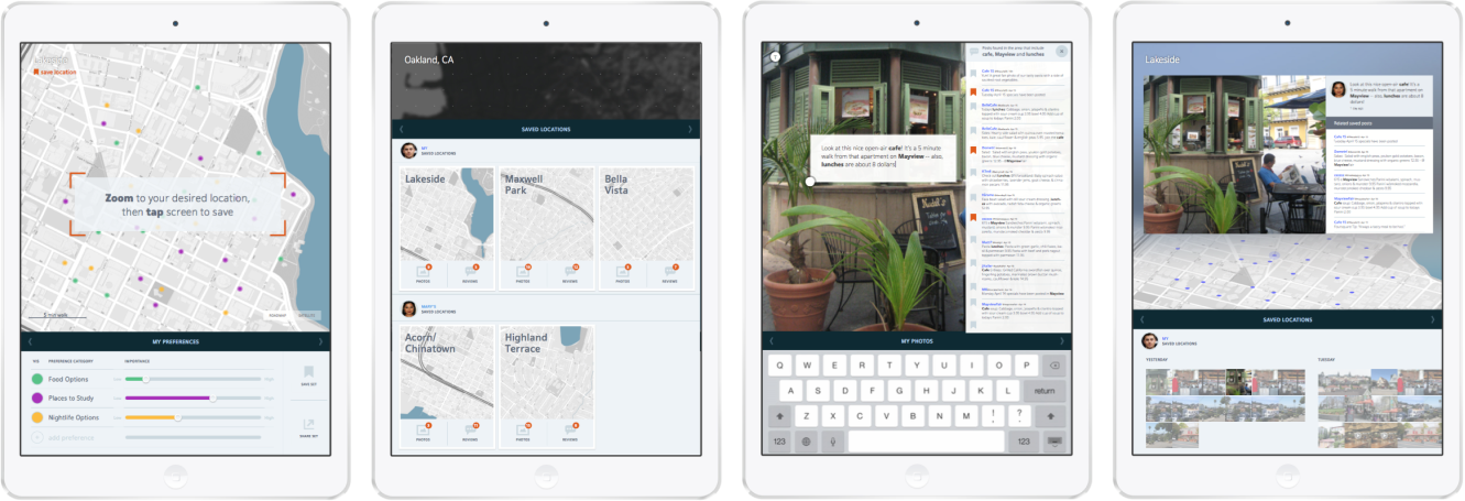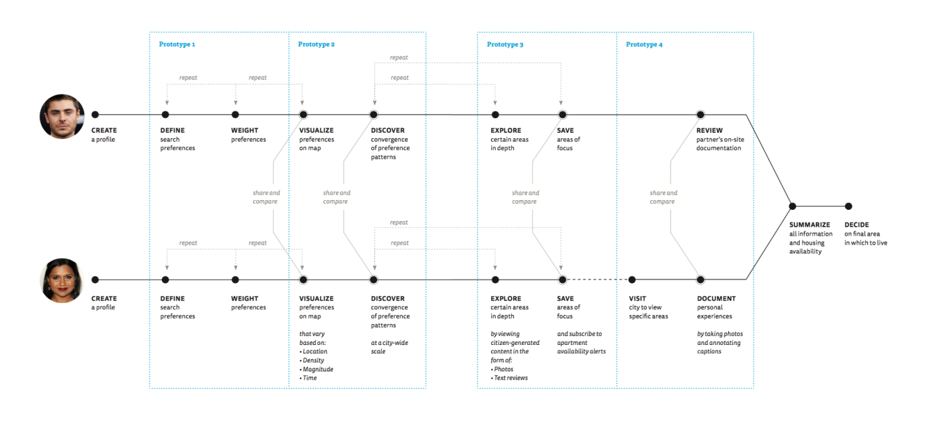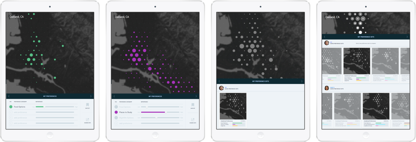 The final outcome of my thesis questions, research, and design explorations focused on four design prototypes, each intended to support a different stage in a user's decision-making process for finding a neighborhood that meets their unique combination of preferences and needs.