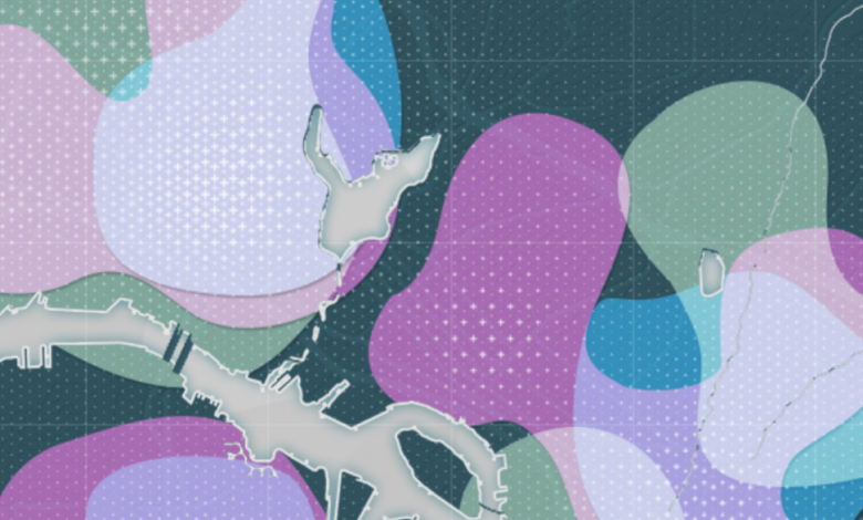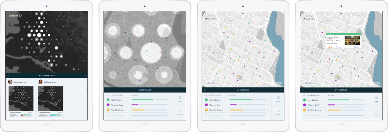 Once the users have identified multiple areas of convergence within their preferences, the map allows for a deeper exploration of these areas. By way of a gestural zoom (pinching out with one’s index finger and thumb), the converging patterns resolve from generalized pattern overlays to points of specific location. Data that relates to the user’s search criteria is now visualized in a more detailed manner, on a refined neighborhood map showing streets and local points of interest. Specific locations are given a geographically accurate place on the map, and information about specific locales (names, hours of operation, etc.) can be accessed via tooltips.