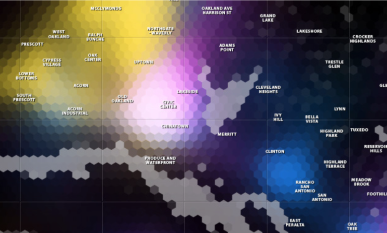 Hierarchical Scales of Space For this exploration, I anticipated the visual relationships between the macro-, city-wide view and the micro-, neighborhood-specific view. These relationships between multiple scales are complex because certain information is appropriate at each scale, yet the viewer still needs to understand that the two representations are related. The city-wide view typically involves generalized visualizations of both place and human activity, while the neighborhood-specific view needs to show more specific data and a concrete depiction of place. I expect this higher level of fidelity includes aerial or satellite photos, as well as user-generated images and content.