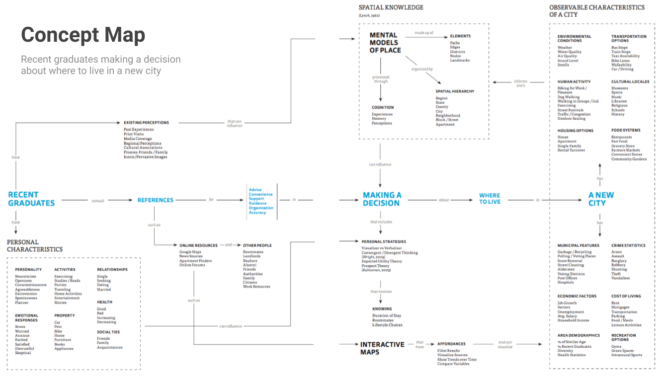 Understanding the complex relationships among audiences, contexts, and problem areas is critical for a designer to establish an appropriate domain of reference when creating successful tools. This is a concept map showing the relationships among a recent graduate, his or her decision-making process, and the observable characteristics of the new city.