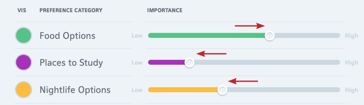 Once multiple preference categories are defined, the system allows the user to weight the importance of each one relative to the others by means of horizontal sliders. Based on the forced-total principle from Thomas Saaty’s (1990) Analytic Hierarchy Process, the increase in weight of one preference results in the decrease in weight of all others. In this way, the system forces the user to prioritize his/her preferences, providing an inherent mechanism for justification.